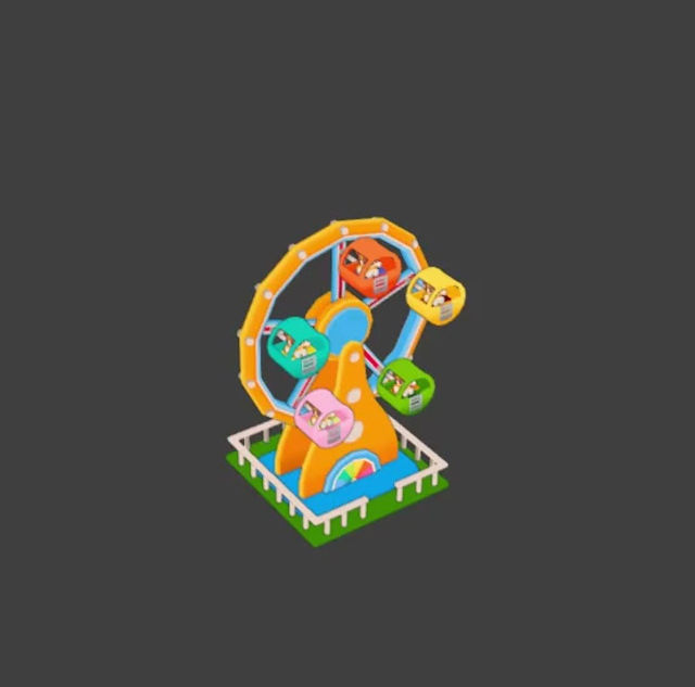 Cartoon-style ferris wheel models created for a children’s game, with each wheel corresponding to a separate game level. The assets are optimized with texture atlases for efficient performance. Simple animations showcase the rotation and operation of the ferris wheels.